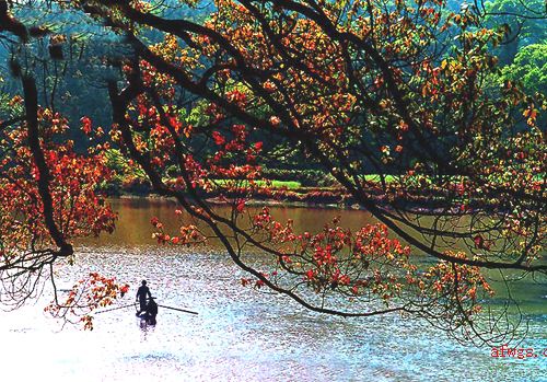 江水流速平缓,江面时窄时宽。一会儿木船被掩隐在竹林丛中,摇曳的枝叶与我们依依牵手,似乎要极力挽留任何路过的客人;一会儿木船又被山体遮挡,峭峰当前,望不见前路出口;一会儿木船又突然搁在宽阔的江心。江水闪着粼粼波光,像整齐排列的游龙,在木船四周翻腾。偶尔,水鸭子冷不防钻出水面,在前方飞快地划出一条笔直的水线,然后再扭动一下轻灵的身姿,又"哗"的一声消失在我们的视线。一群群白鹭扑打着翅膀忽左忽右来回地穿行。时而停在树梢上,时而钻进草丛中,时而又在江面俯冲,一群来了一群去,一群去了一群来。船到最深处,飘着花叶的漩涡围着船沿一起翻腾着或大或小的白泡泡,像雨打水面船令人眼花缭乱。 同伴要用竹杆探探水深,突然草丛里游出一对鸳鸯,旁若无人、追逐嬉戏。我们不忍惊动它们的柔情蜜意,倾身注视着,尽量不作喧哗,目送它们渐渐远去......。